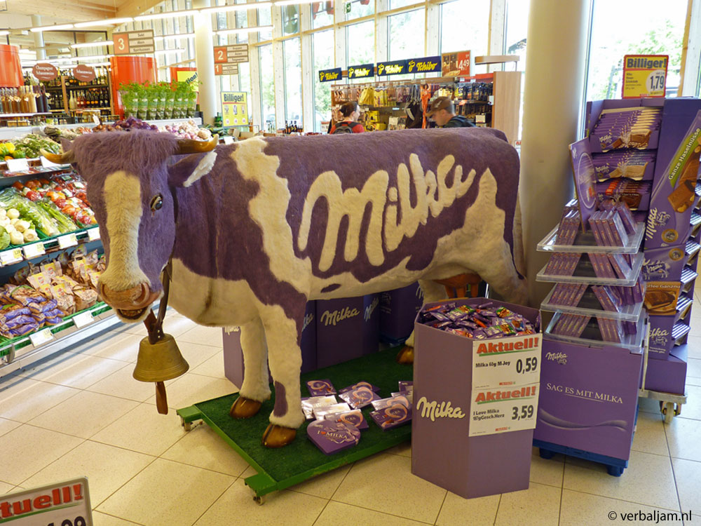 De Milka koe blijkt echt te bestaan. Hij Zij staat in een Oostenrijkse supermarkt.