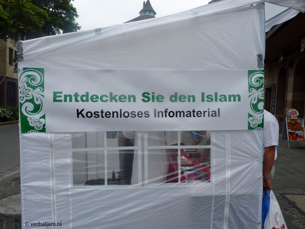 Op het tentje in Neurenberg stond: 'Entdecken Sie den Islam' ('Ontdek de islam').
