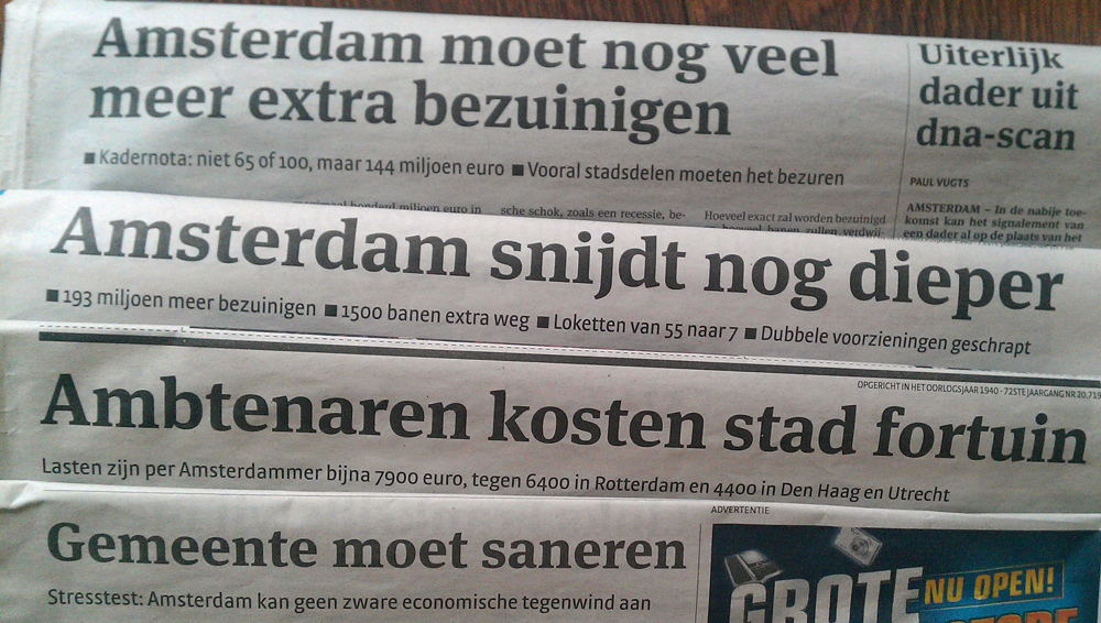 Woensdag 16 Mei 2012 in categorie Amsterdam Centraal, GeldkwestiesIk word gehersenspoeld. Mijn geest wordt rijp gemaakt voor een gigantische gemeentelijke bezuinigingsoperatie. Sinds anderhalve week slaat onze dorpskrant het Parool de lezer met de ene crisiskrantenkop na de andere om de oren. Elke Amsterdammer gaat dit voelen, is de boodschap. Het lijkt mij dus verstandig om nu alvast mijn abonnement op het Parool op te zeggen. Ik voorkom hiermee een persoonlijk kastekort en een depressie.